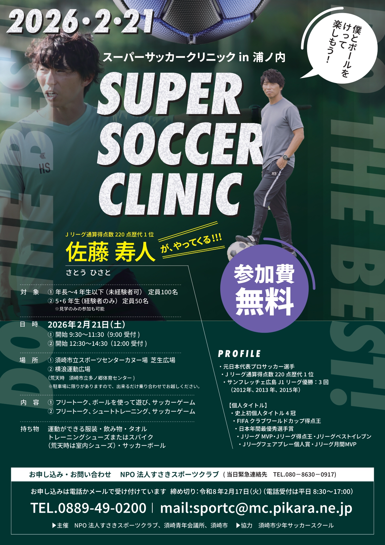元日本代表プロサッカー選手である佐藤寿人さんを特別コーチに迎えたサッカークリニックを開催します。